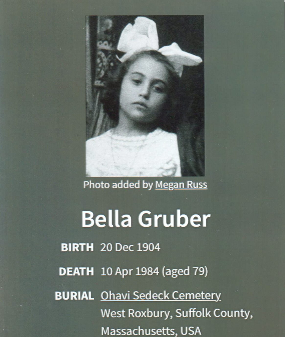 6) Bella Gruber – Find-A-Grave (Ohavi Sedeck Cemetery)