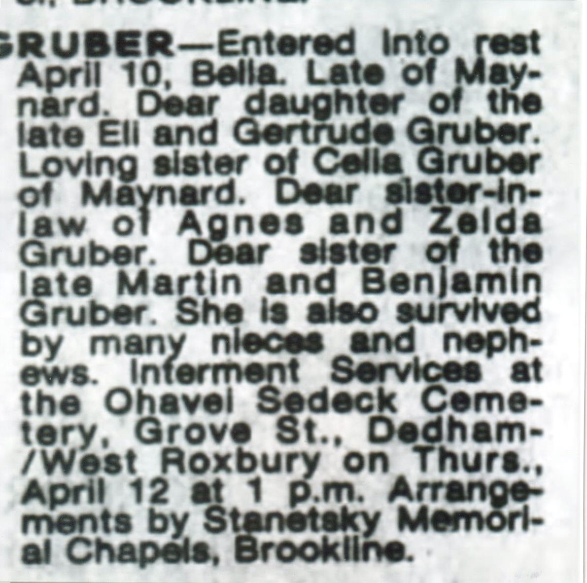 5) Bella Gruber obituary (4/10/1984). Boston Globe