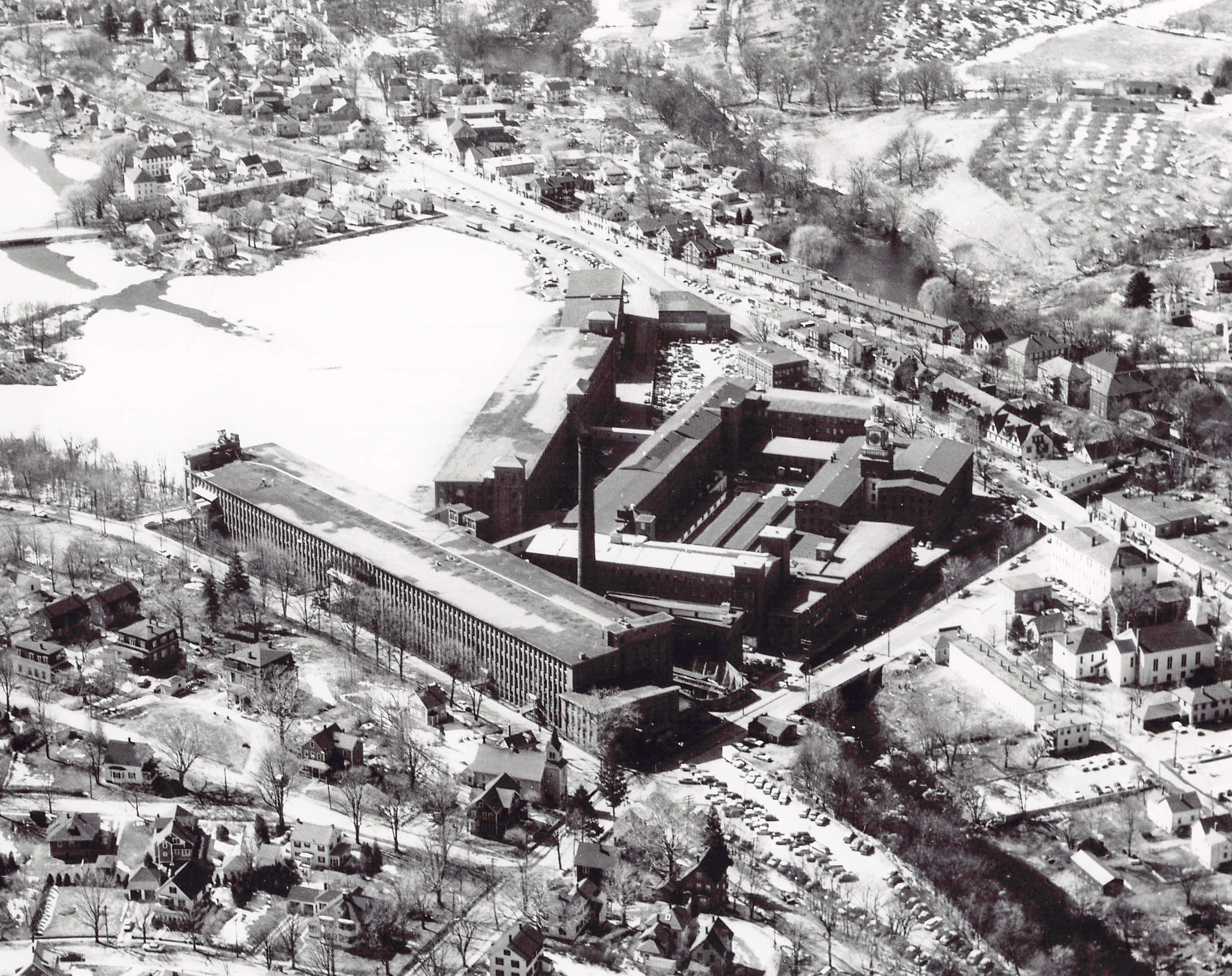 This photo appears to have been taken during winter facing northwest, providing an aerial perspective of the mill from Thompson Street. Main Street and the "West End" of Maynard are off in the distance. The agricultural land across the Assabet River would become Summer Hill Glen.