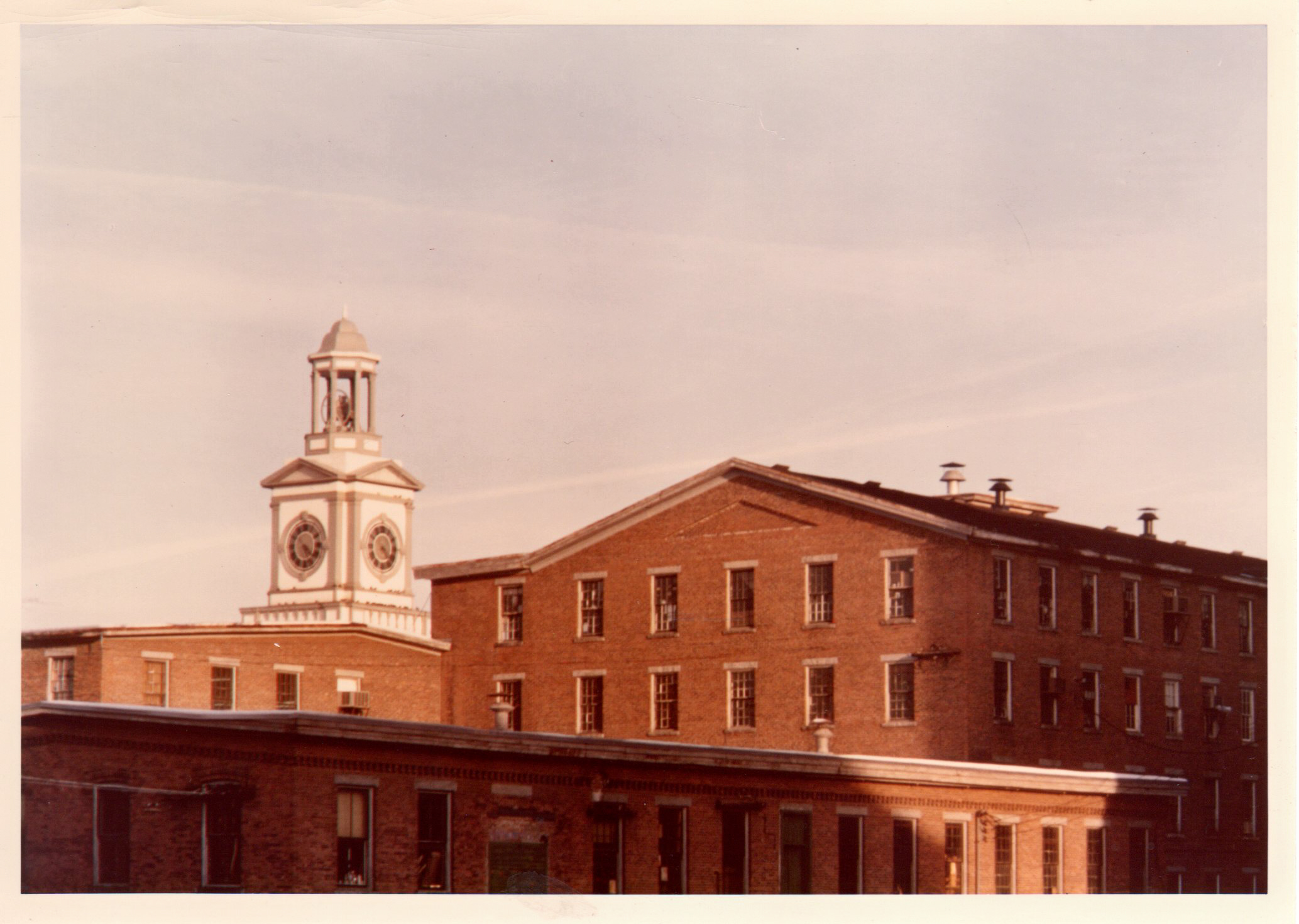 This southerly view of the Tower Clock is likely taken from Mill & Main building #10. The lower building in the foreground was demolished around 2010 to make way for the current main entrance to the Mill.