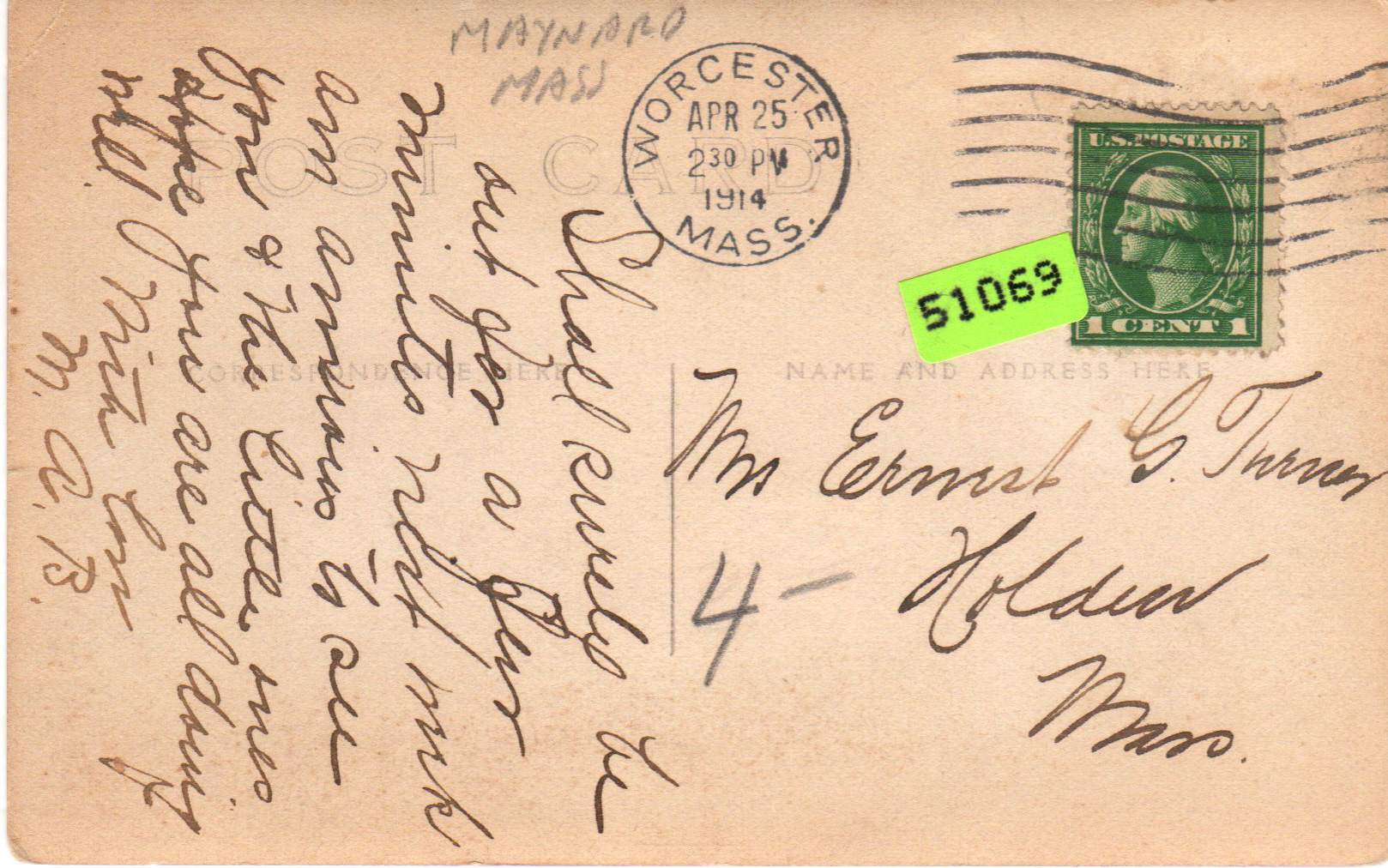 An old postcard of M. A. Batley in the Batley Greenhouse. The postcard is dated April 25, 1914, addressed to Mrs. Ernest G. Turner of Holden , Mass., from M. A. B.