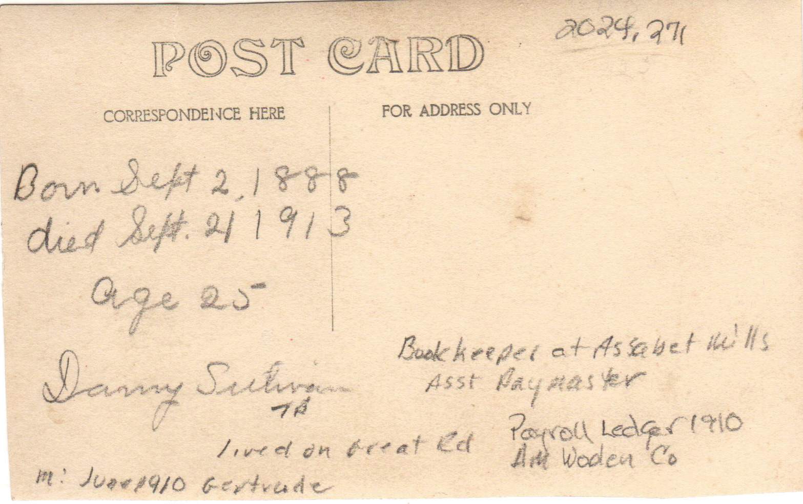 A post card photo of Daniel Sullivan who was born in 1888. "Danny" Sullivan worked as an Assistant Paymaster in the American Woolen Company office. His family lived on Great Road in Maynard. His parents were James & Hannah Sullivan, Maynard.